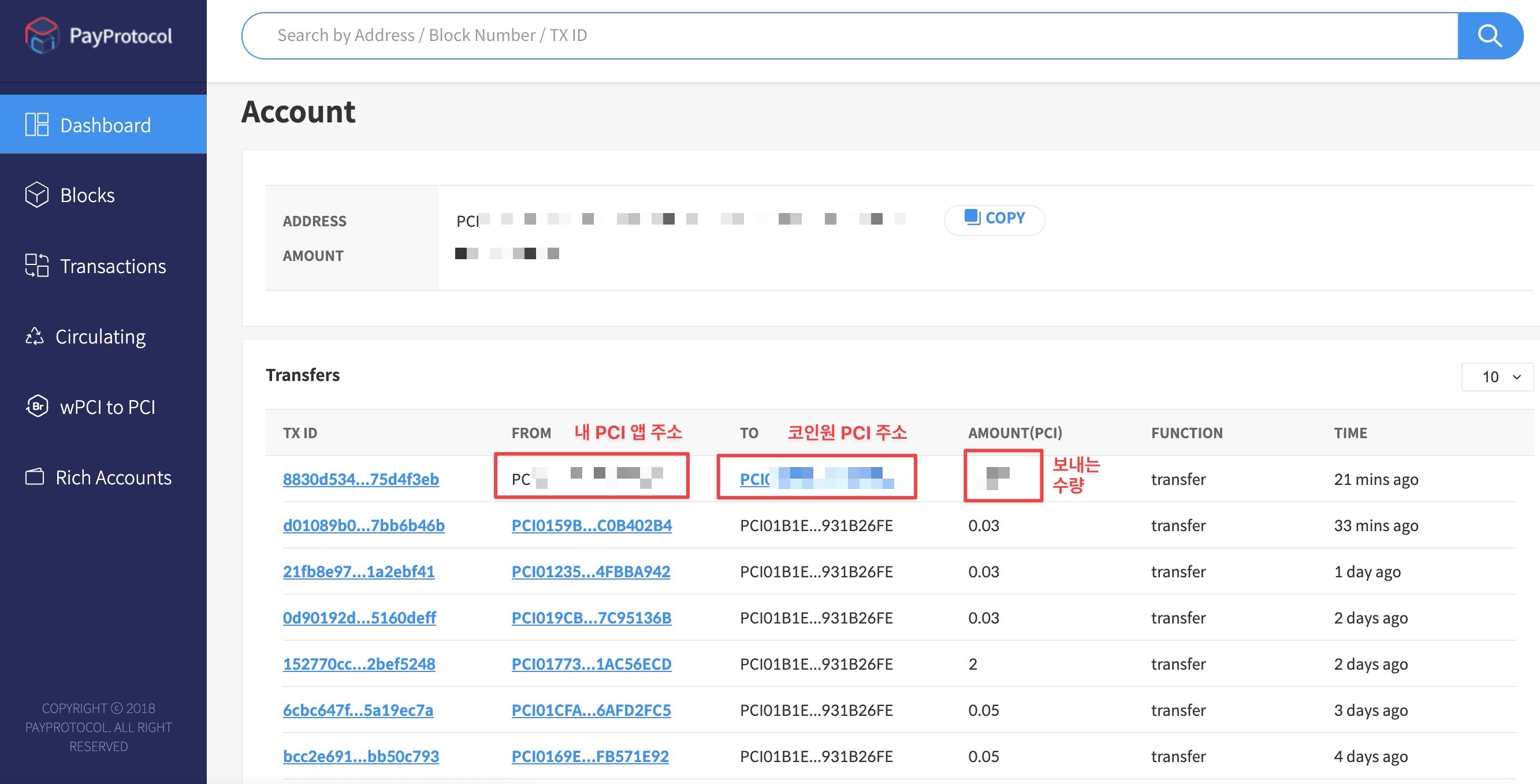 전송한 후에 제대로 블록체인에 전파가 되었는지 확인하려면 페이프로토콜 익스플로러에서 조회해 볼 수 있습니다.