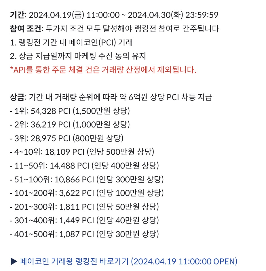 4월 한달 간 거래량 상위 이용자에게 상금을 주는 이벤트입니다.
